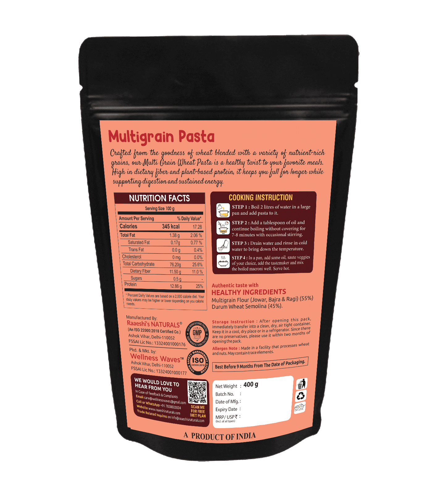 Rich in dietary fibre, plant protein, and essential minerals, multigrain pasta supports better digestion, sustained energy, and balanced nutrition. Its firm, non-sticky texture holds sauces beautifully, making it perfect for Indian and international recipes alike.