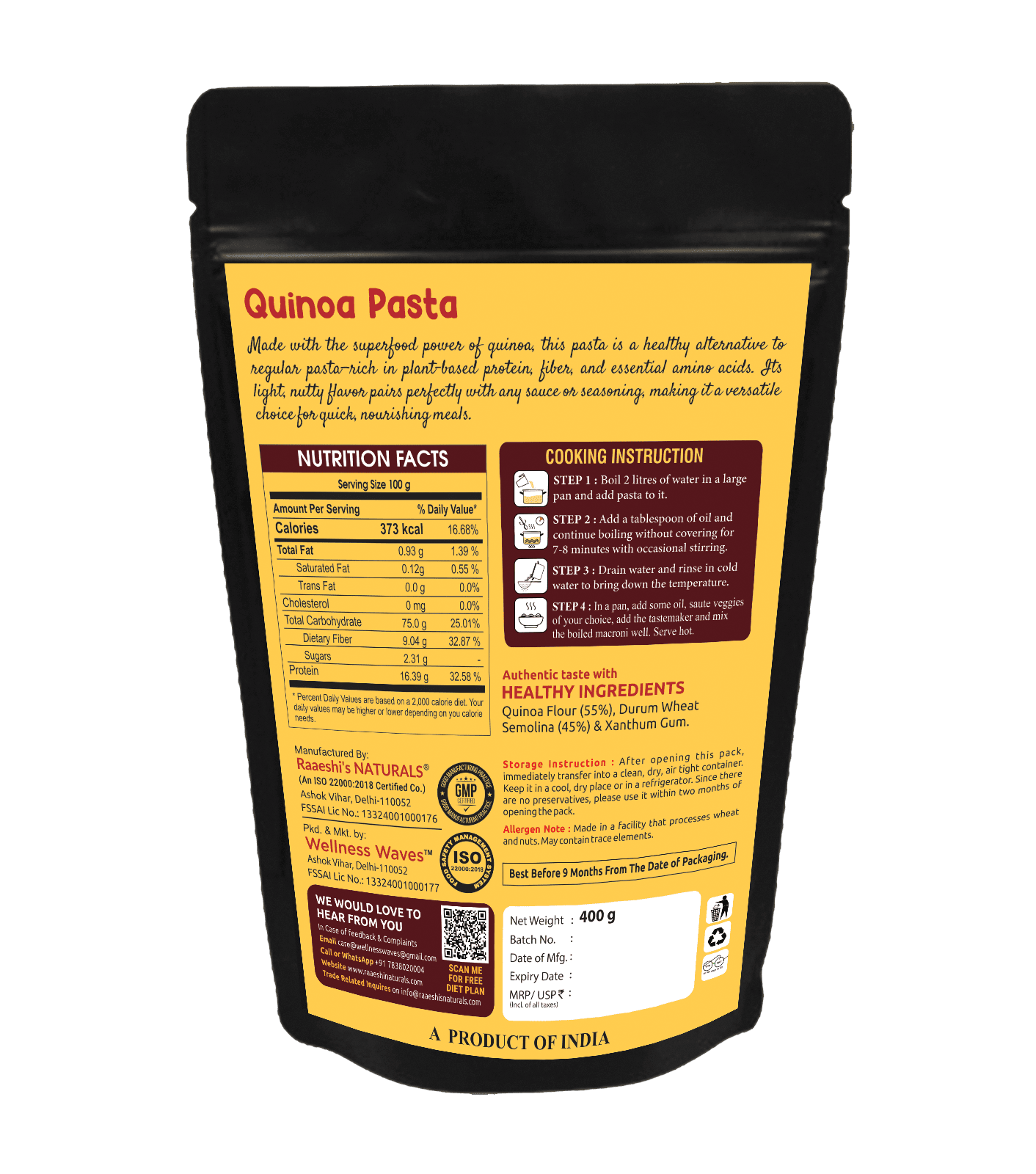 With a low glycaemic index and easy digestibility, quinoa pasta provides sustained energy without blood sugar spikes. Free from maida, preservatives, and artificial additives, it delivers clean nutrition with great taste—ideal for kids and adults alike. Enjoy it with classic sauces or Indian-style masala for a wholesome, guilt-free meal.