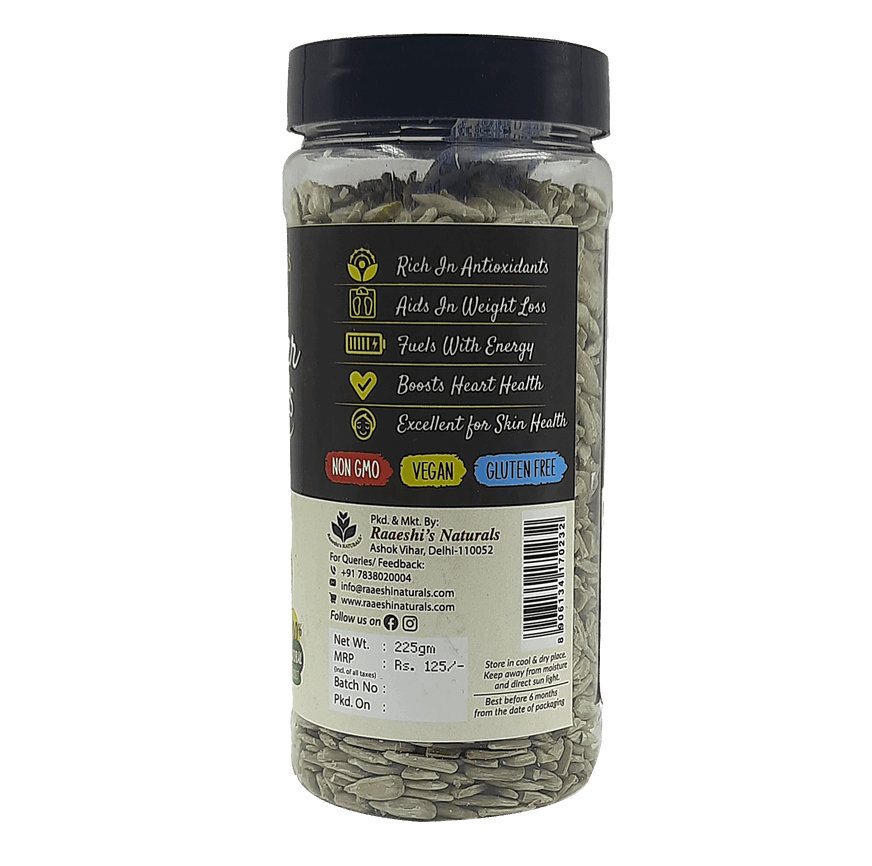 Sunflower Seeds are crunchy, nutrient-dense seeds packed with healthy fats, plant protein, dietary fiber, vitamin E, magnesium, selenium, and antioxidants. Regular consumption supports heart health, skin & hair wellness, immunity, energy levels, and overall vitality.